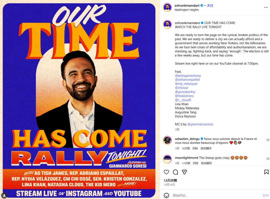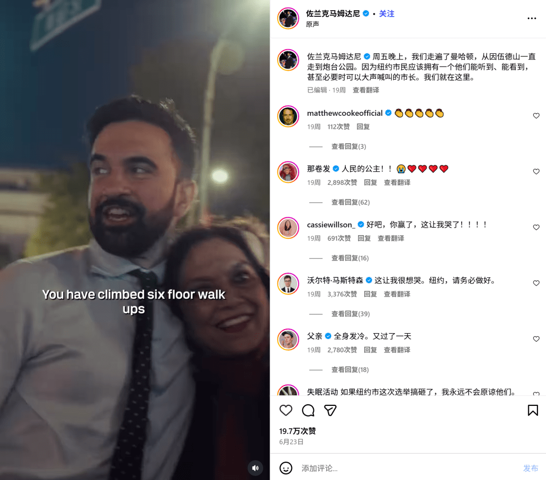 身为大导演之子的马姆达尼,在社交媒体和短视频当道的时代,将信手拈来的媒体技巧发挥到最大化,是个粉丝百万的政治网红,深得纽约Z世代年轻选民喜爱。