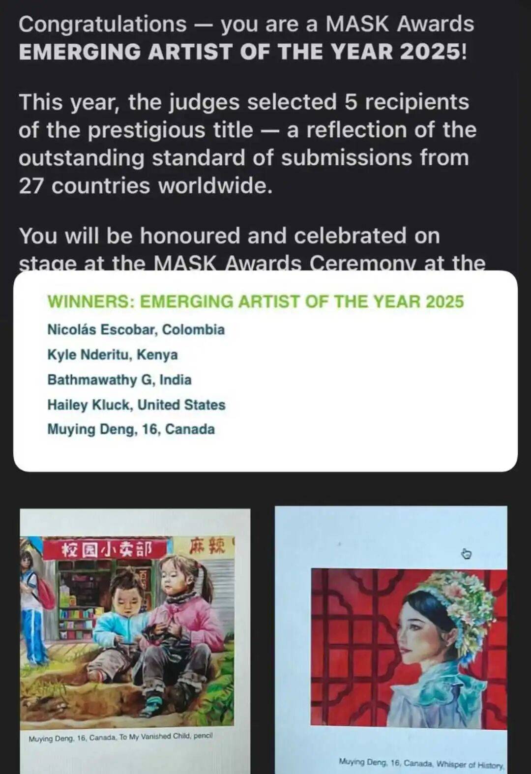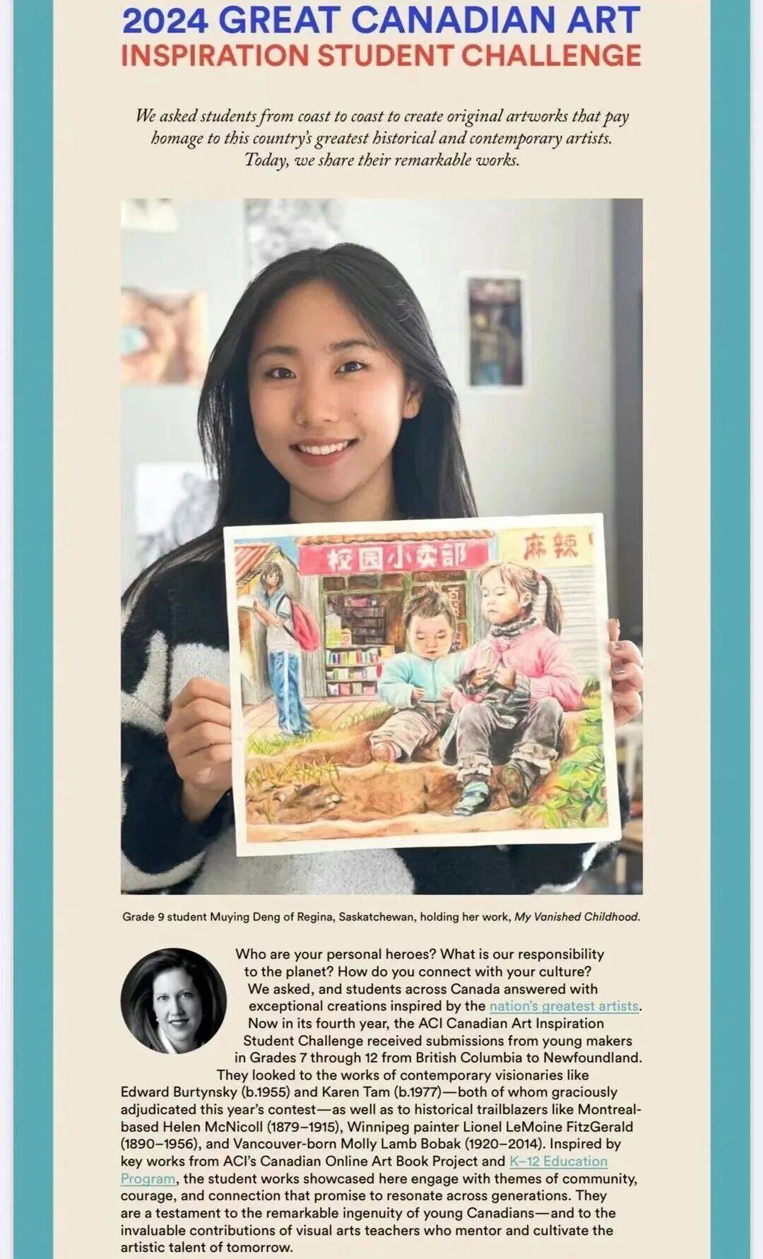 去年,妹妹曾以自己和姐姐的童年故事为主题画了一幅画《致我逝去的童年》,并参加了加拿大艺术灵感学生的挑战赛,进入决赛后顺利获奖🏆,还获得了250加币的奖金。