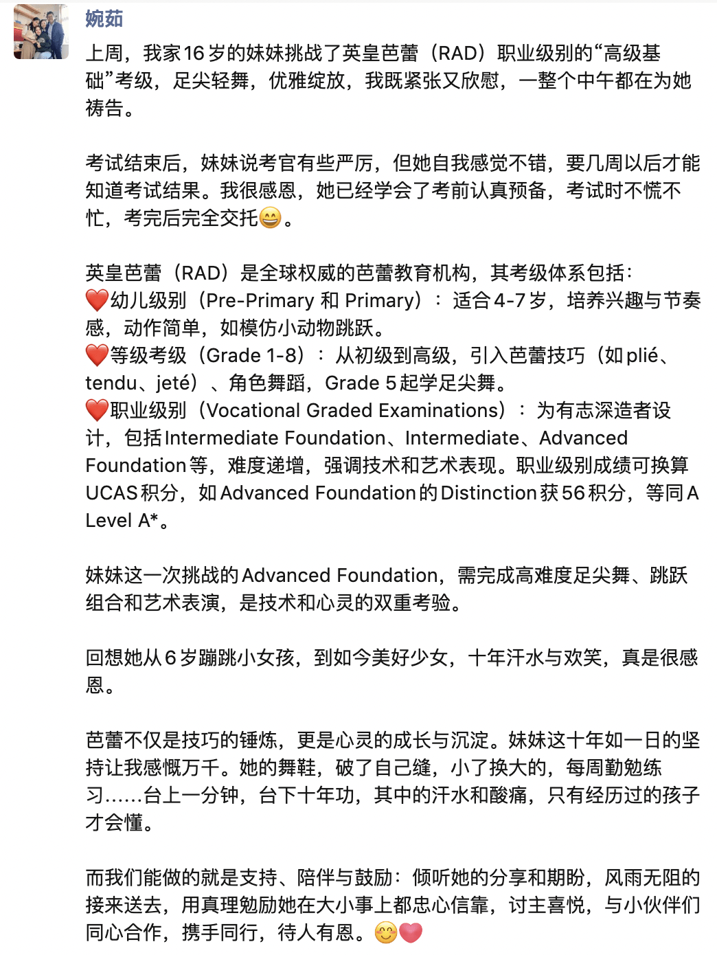 十年的舞蹈训练,并没有让她变得急躁,反而塑造了一种安静而坚定的气质。考级并不是终点,她也开始主动为自己设立下一阶段的考级目标,清楚知道这条路需要长期的耐心与节制。