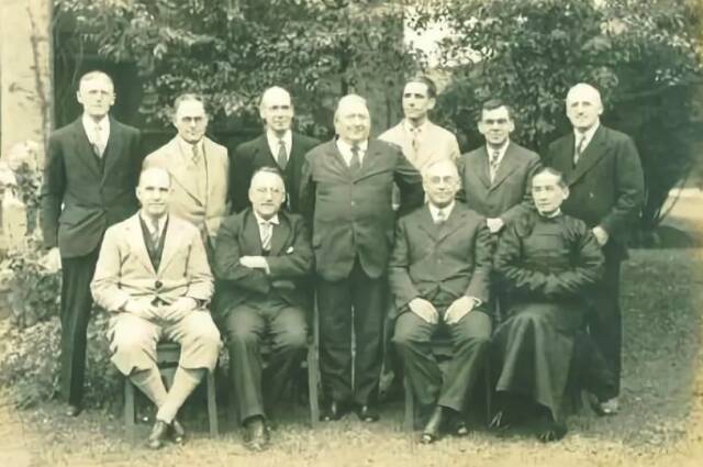 1922年,华大成立“华西边疆研究学会”以人类学研究为主兼及地理学、地质学及生物学等学科,戴谦和是主要成员之一,他用自己的热情和知识,为博物馆收集了大量标本和文物,馆藏有西部地区最大的石器群,包括来自西藏、甘肃等地的收藏物,最有价值的是北京周口店猿人同时期的兽犬骨化石、猿人吃剩的草实外壳化石。初期西边疆研究协会成员合影;前排右一杨少荃,右二莫尔斯,右三为埃德加,右四启尔德,后面右三为毕启,左一葛维汉,左二启真德,左三戴谦和。
