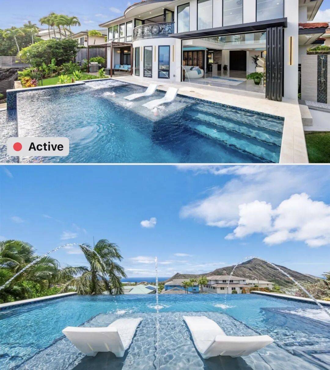 这套将近600万美金的房产,算成人民币要4000多万了哇。面向大海春暖花开,自己带个喷水游泳池,装修也是现代大气有品味(我不做房产中介真是可惜了)。