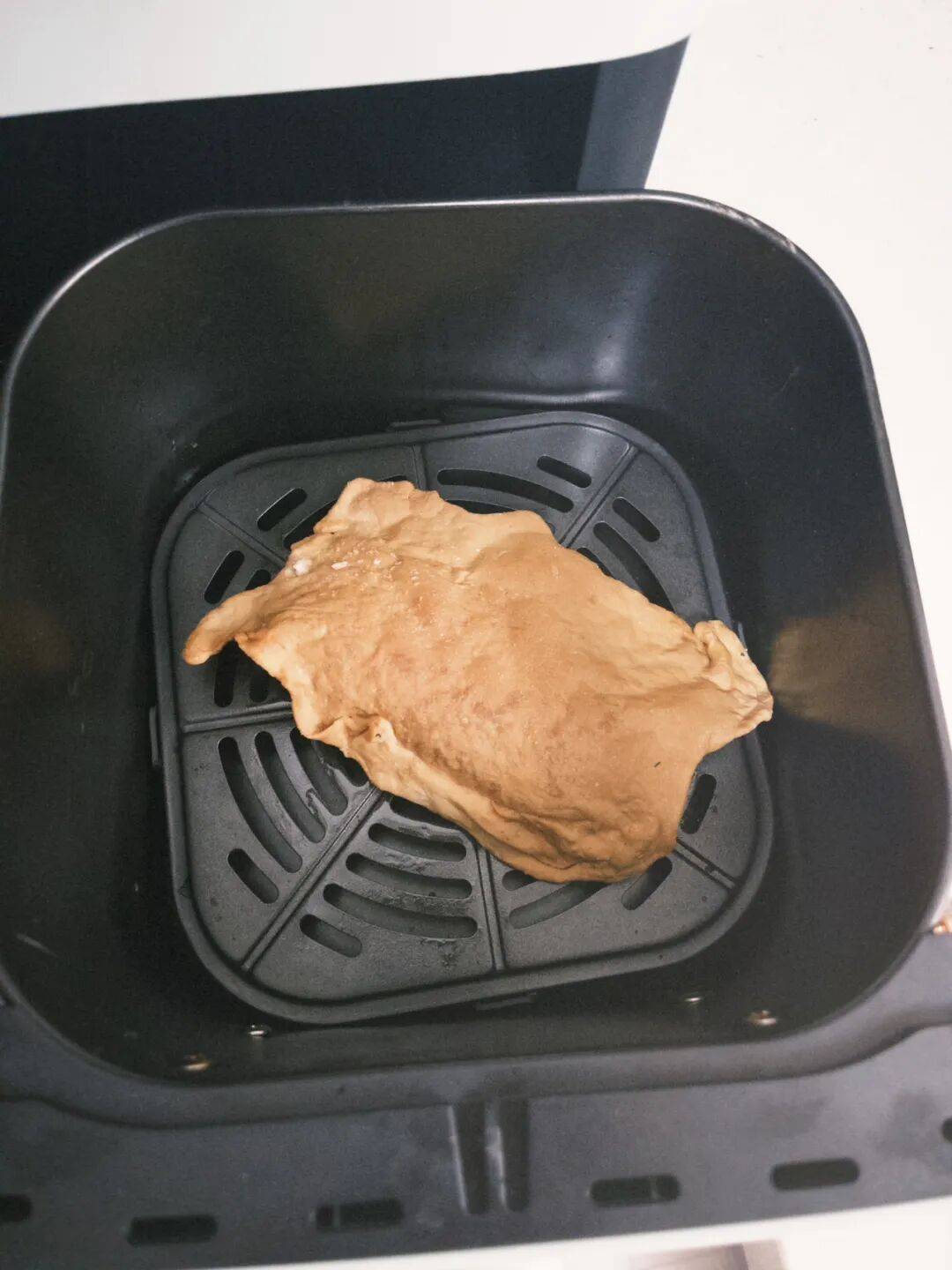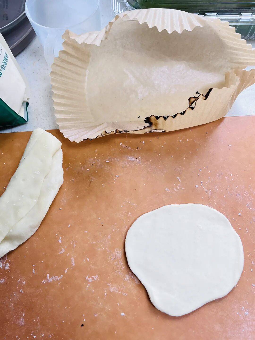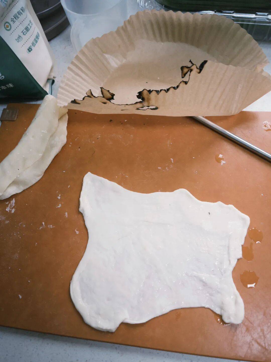 放进空气炸锅,200度8分钟,哇,怎么没多久就有焦味!这个纸烧焦了,覆盖在了饼上。我不该放纸!