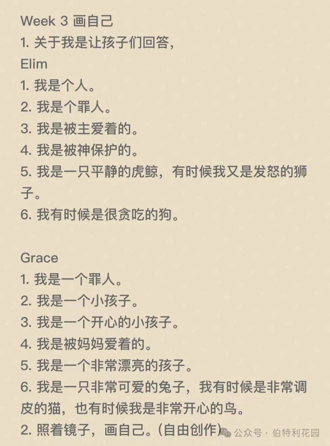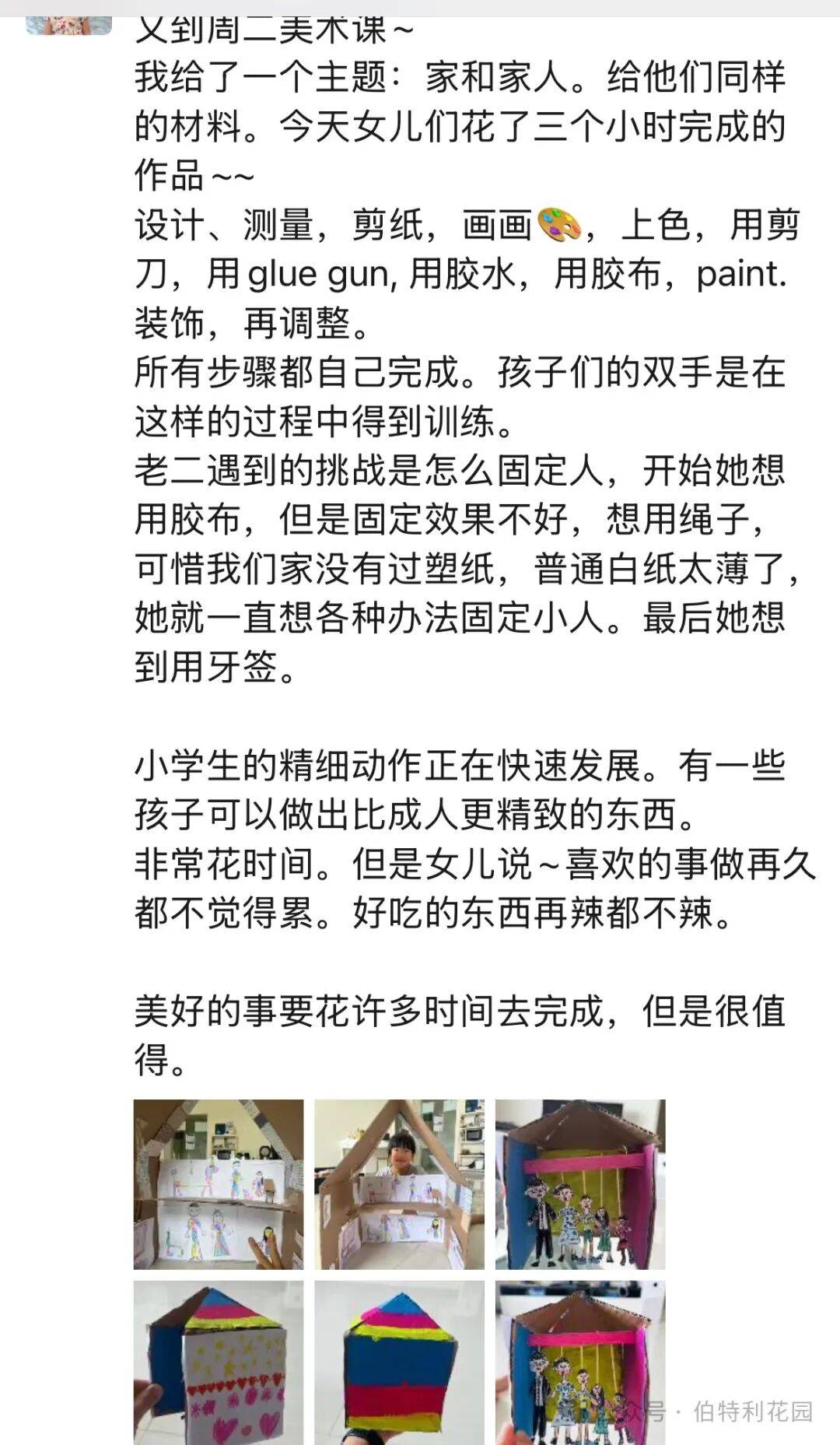 首页信仰生活 记录Art Class (一)Week 1-Week 8 2024.8-10月 By 伯特利花园 2025年 2月 16日 8 想记录一些孩子画画的内容。因为孩子慢慢长大,他们就很难画出小时候的画,但愿这些美好的时光成为他们一生很重要的财富。我虽然不懂画画,但是我知道如何引导。孩子小时候也很够了。爱孩子,鼓励孩子,多多支持他们,给他们时间去画。以琳8-9岁,以星6-7岁。(Again, 只是记录自己如何教孩子画画,不从专业角度去探讨画画技巧等,因为自己也不是学画画的,自己也不会画画) 孩子们通常都在饭桌上画画,因为比较大,可以放她们各种画笔画具。 孩子们除了画画课之外,她们也会在空闲时间画很多她们喜欢的东西。 Week 1画房子 Week 2 艺术是在用心,用脑,用创造力,用想象力。 桌子一如既往的乱。(没有关系,画完整理一下就好了) Week 3 画自己。先和孩子们有一些对话,记录下来。再让孩子创作。 可以给孩子找出家里的镜子。如果没有也可以在镜子里观察自己。 week 4 用厕所卷纸筒做任何想做的东西。(家里有很多收集的,不想浪费) 我和女儿们都泡了一杯茶,品了品茶,告诉她们我们的手可以做许多的事情。问女儿手可以做什么!给他们一些卡纸还有厕所卷纸,让她们自由创作。 因为需要用glue gun,所以孩子们画画的场地转战到地上。 以星做了一辆公交车。 以琳做了一个手机支架。(works perfectly) 以琳还做了一个漂亮装饰。(并配上了经文) week 5 Nature Hunt. 给孩子许多的时间,让他们去自己寻找素材。在大自然中去寻找不同的色彩。这位最棒的大画家已经在我们周边的环境画上了各种色彩。 Week 6 做冰淇淋。还有哪个孩子不爱冰淇淋呢?只是给他们看一些图片,让他们自由创作。 孩子们只要想创作,那家里就别想太干净。我已经完全接受了这就是艺术。以星也常常告诉邻居:IT’S okay. Art is messy sometimes. 没关系的,脏了可以整理的。 Week 7 后花园的植物。我感觉不舒服,头晕感冒。但带着毯子去了后花园,那里几乎没有人,我们打破了宁静。让孩子在后花园画画。带了颜料,蜡笔,还带了一些漂亮的纸。 Week 8 家和家人。孩子们用自己能表达的方式表现出这个主题。被以琳小小的创意惊到,把家里的每个人都做的精致可爱,看着简单,女儿花了好多时间解决问题。以星做的大大的房子很贴合她性格,她是大大咧咧的性格。 诚如我所记录的:美好的事情它值得花时间去做。孩子们的手越来越灵巧。 分享 EmailCopy URLFacebookTwitterPinterestWhatsAppTelegram 所属主题信仰生活 前一篇文章杨太太|记我在美国做刑事辩护之新手村的最后一天下一篇文章杨太太|从“解决本质问题”开始认真生活 伯特利花园分享好的资源,交流育儿经验,记录儿女还在家的日子。wechat:huimin521113 阅读更多 信仰生活 杨太太|2026年春季预告篇 2026年 1月 10日 信仰生活 医 治 2026年 1月 7日 信仰生活 东门旧事丨璟璟 2026年 1月 6日 最新文章 杨太太|2026年春季预告篇 2026年 1月 10日 二鱼:马杜罗被抓的内幕勾勒出世界巨变前夜 2026年 1月 10日 医 治 2026年 1月 7日 萧三匝:只有重回神州,才能走向自由 2026年 1月 7日 查看更多