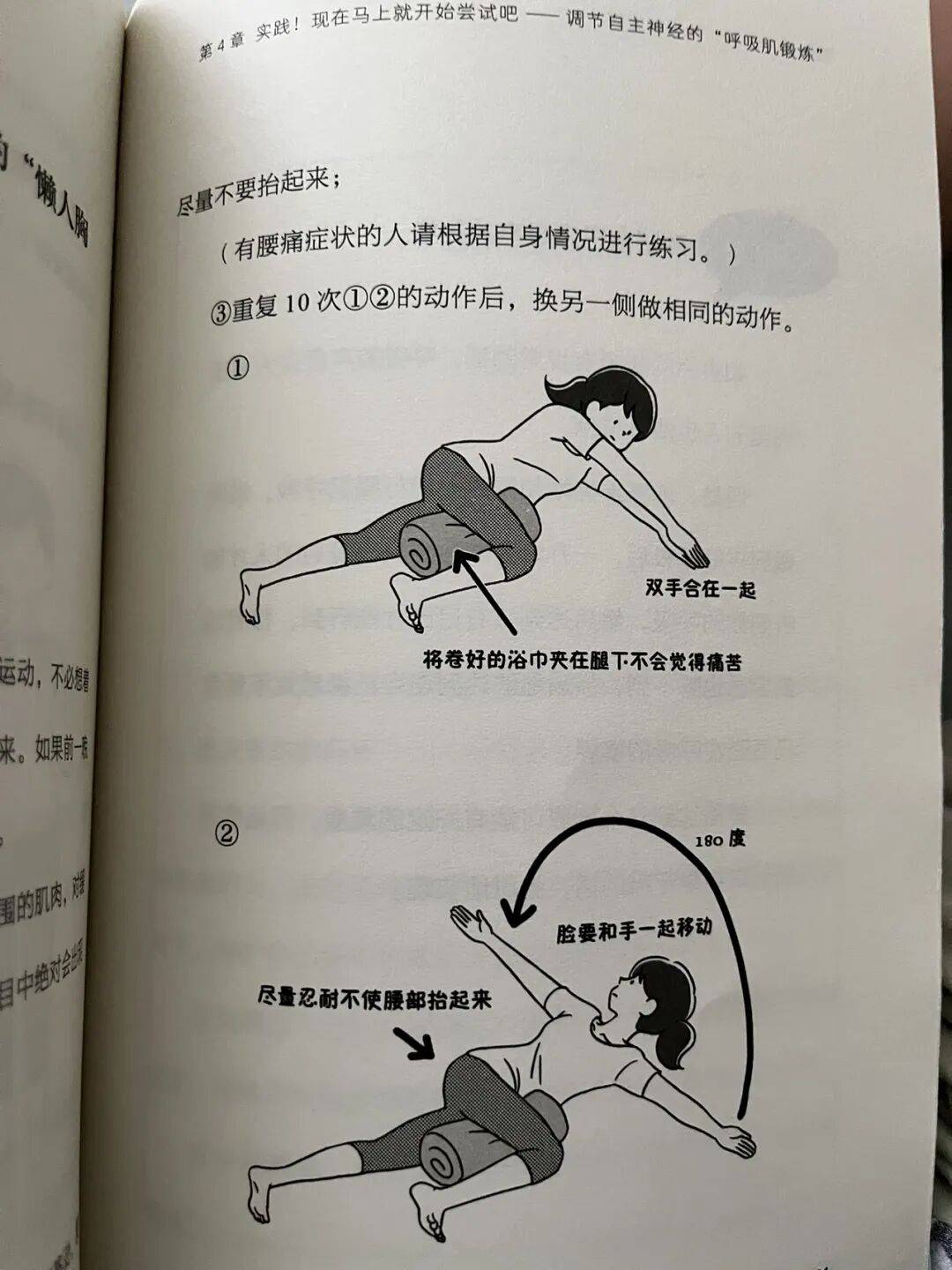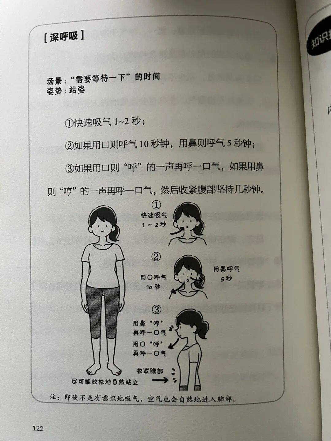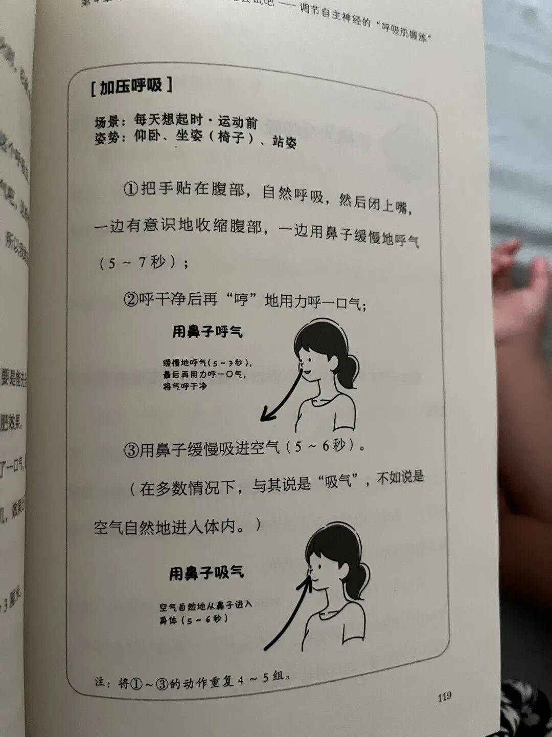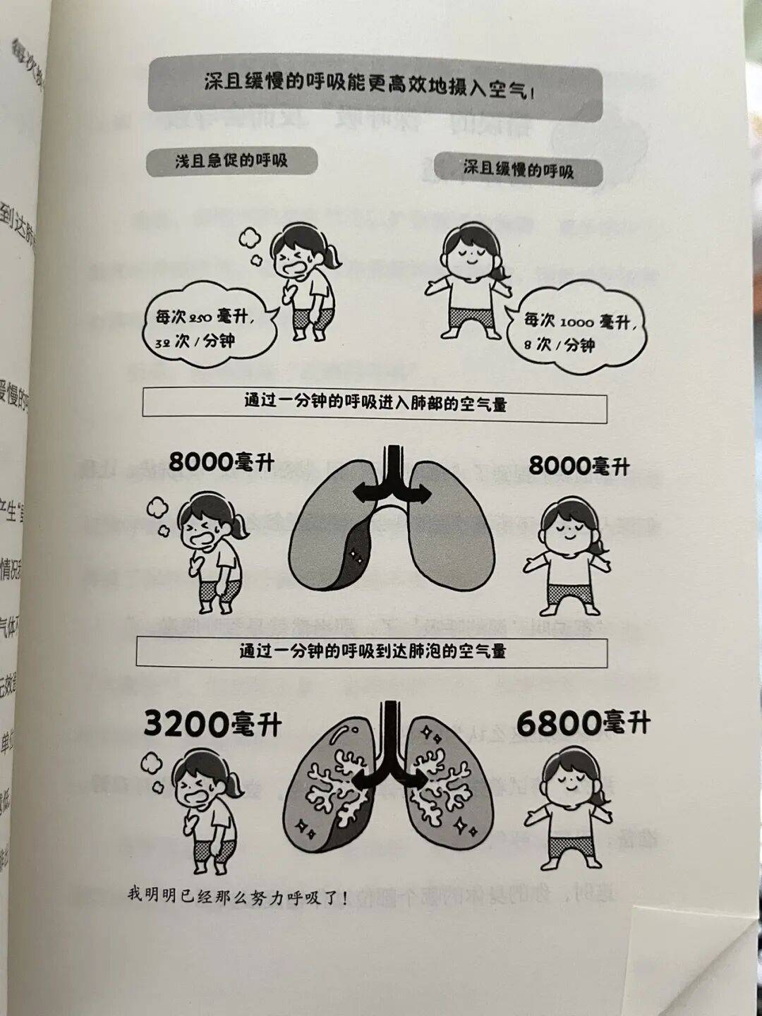 虽然是科普性质的小书,读起来非常轻松,一点也不晦涩难懂,搭配生动的插图帮助理解。这本书的特点是前两章有非常多的自测,帮助读者可以快速定位自己的呼吸方式,后面两章介绍作者推崇的膈肌呼吸法,另外还介绍了一些帮助肌肉伸展的运动。