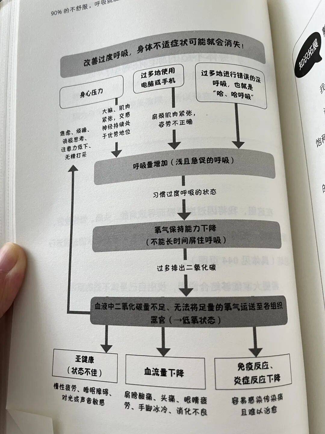 其中特别提到,现代社会,尤其是网络媒体,电子设备的过度使用,迫使人们被不需要的信息追逐,人们接连不断地看新闻,刷朋友圈……这也解释了为什么人们会越看越焦虑,因为压力和紧迫感会导致呼吸变浅且急促,就人容易陷入过度呼吸的恶性循环。