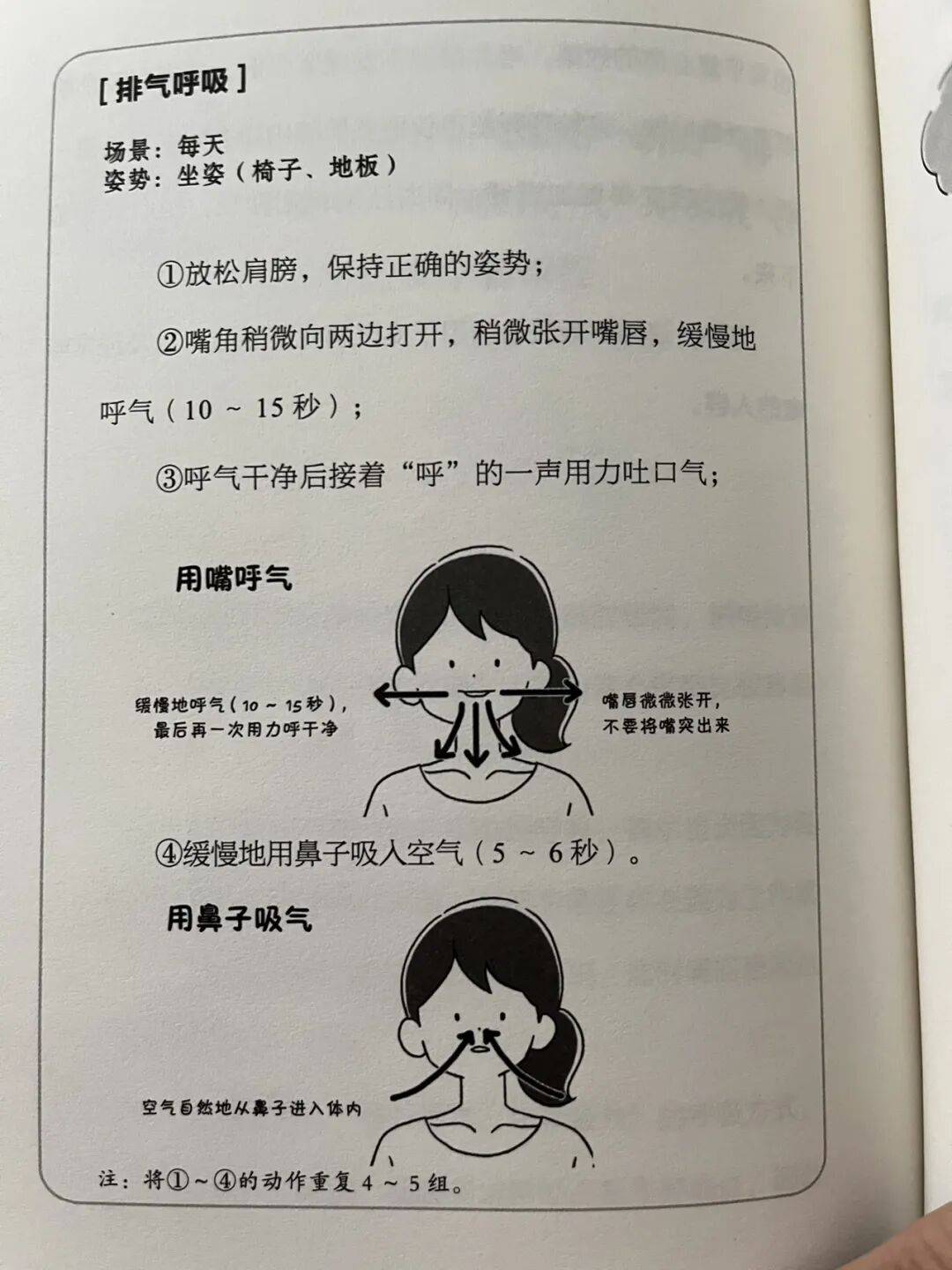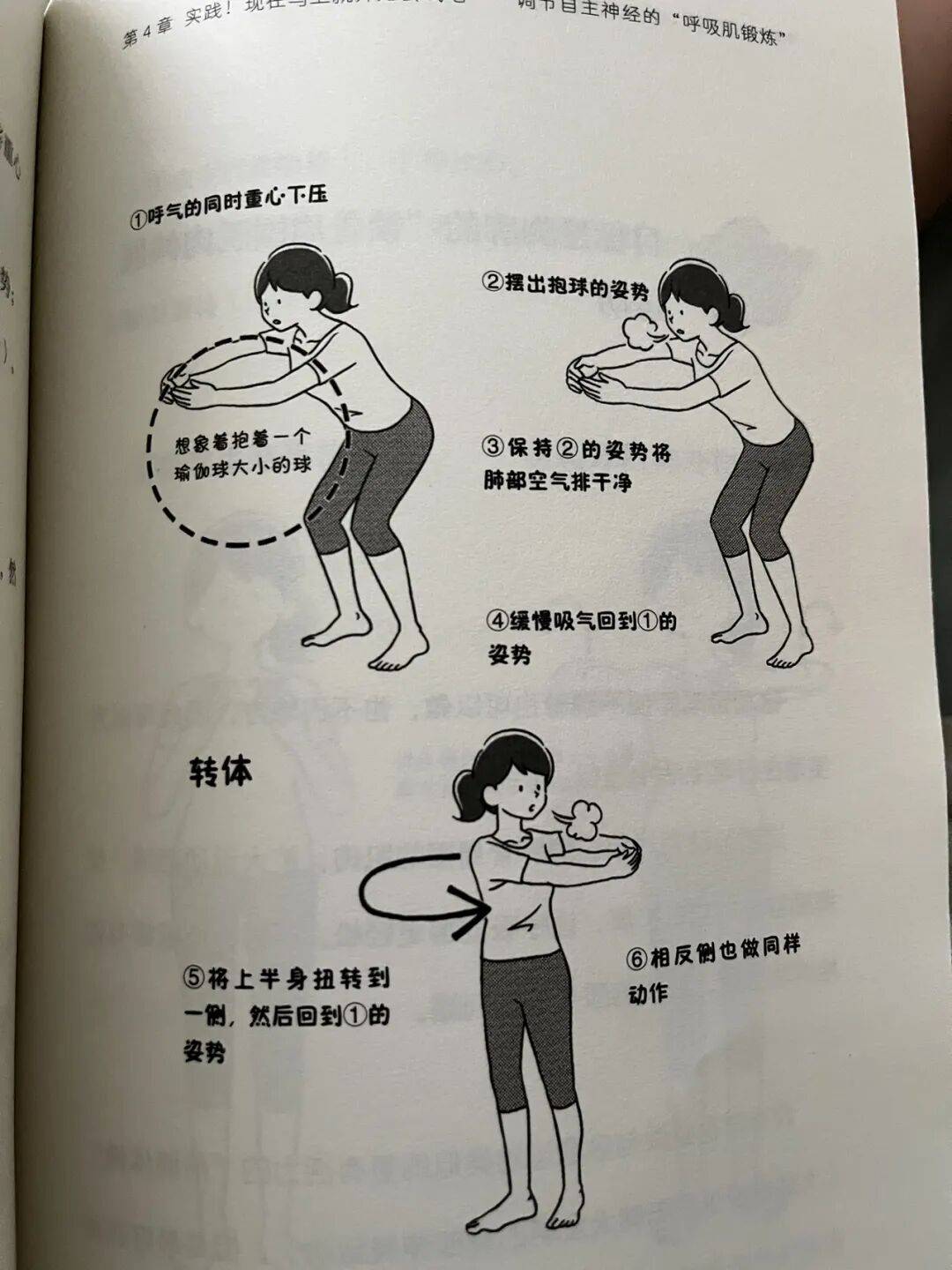 在最后一章中,作者带领读者进行呼吸法的实践训练,结合图文一步步带领确认胸部和腹部的动作,并端正姿势。随后又介绍了“排气呼吸”和“加压呼吸”两种方式,以及好几种伸展运动,来帮助“呼吸肌”锻炼。