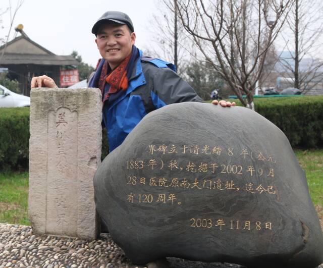 笔者与界碑合影