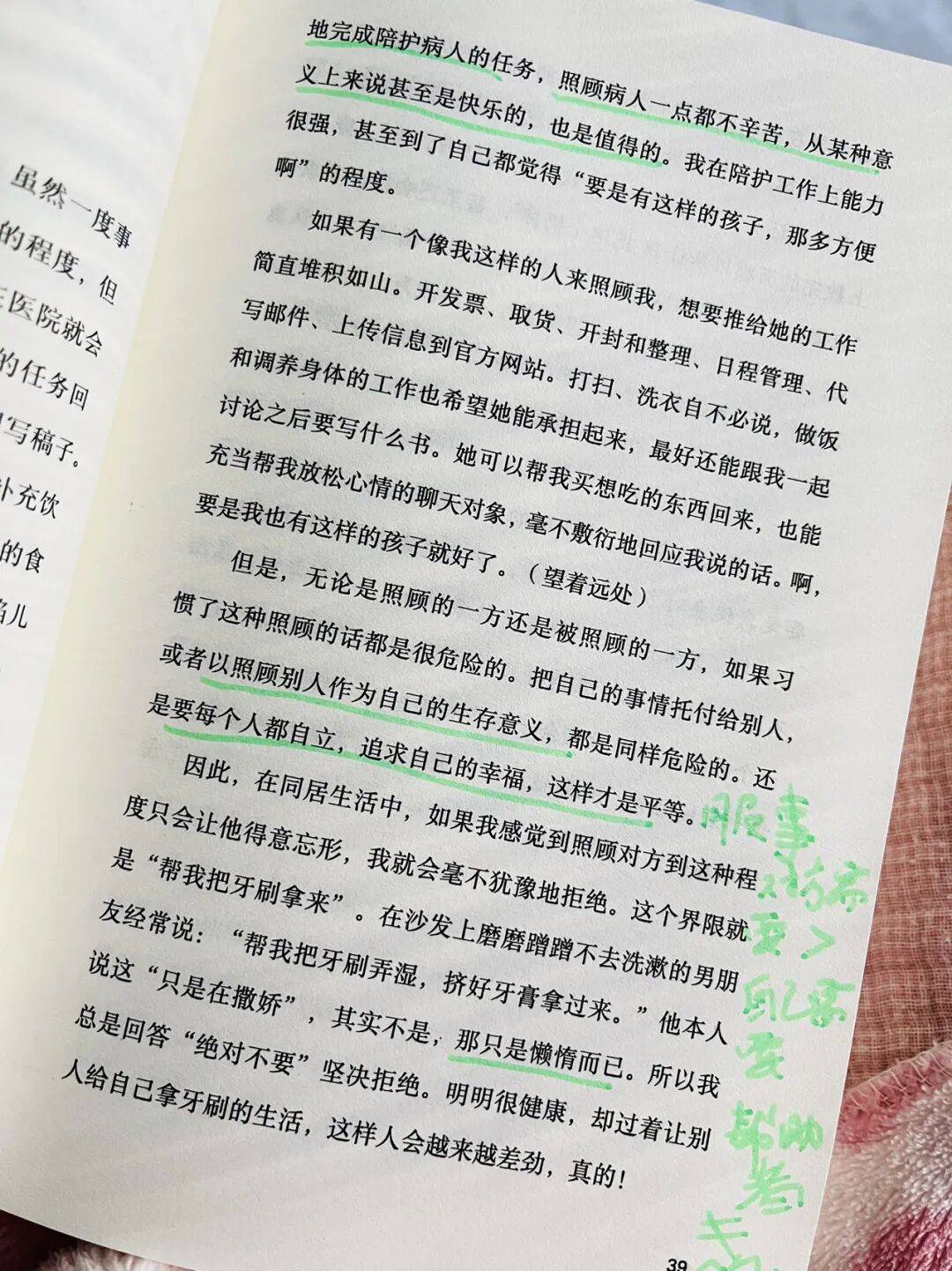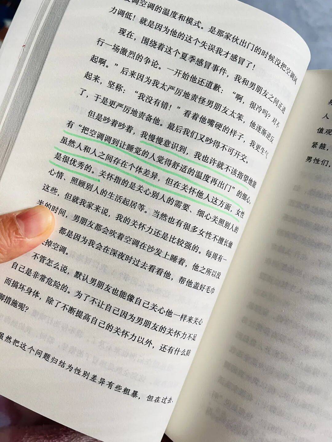 纵览笔记,我看到作者是在一步一步成长,当她被丈夫设置的空调温度冻醒时,她慢慢意识到也许不该指望丈夫有和女性一样优秀的关怀他人的细心。