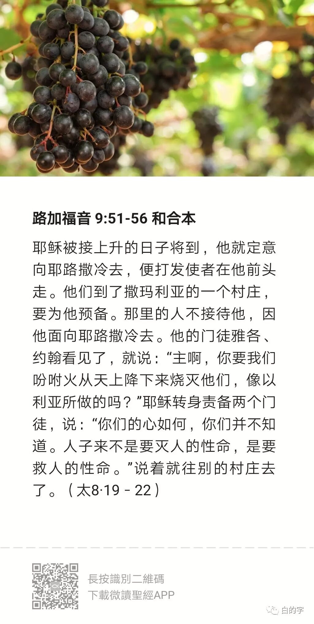 早上祷告的时候想到这段经文。很受感动。当门徒在愤怒之下,要灭了那个不接待神儿子的村庄,这似乎是正义之怒。如果你站在上帝的一边,看到世界上那么多的人如此怠慢,亵渎上帝,是多么容易引发你的愤怒之火。而且最要紧的是,你是为了正义而怒,想消灭一切邪恶。这没有任何不合理的地方。