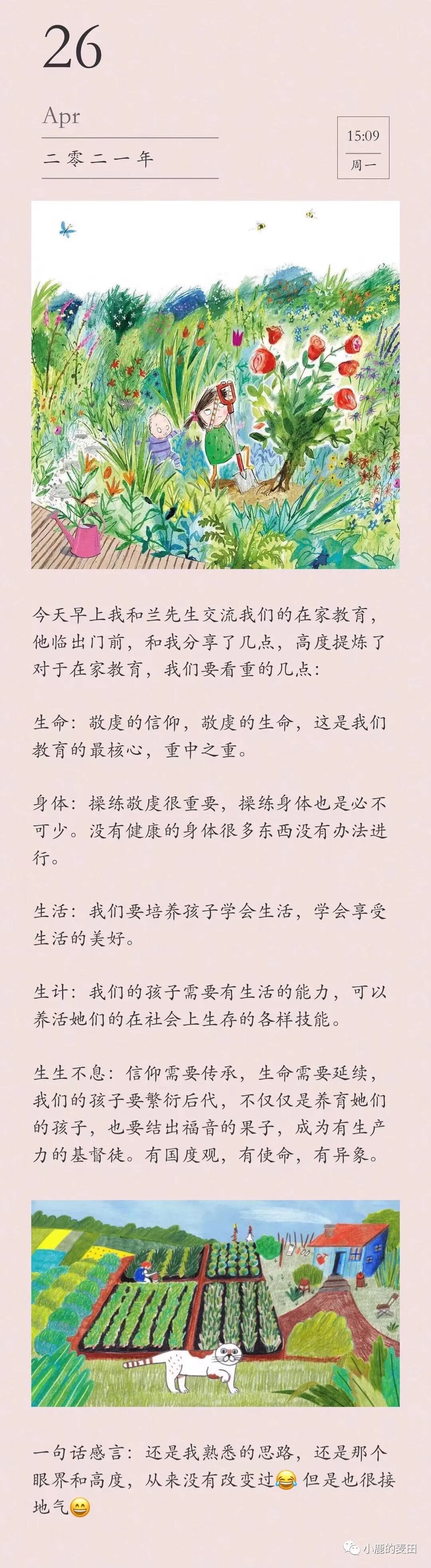 我和兰先生相比没有那么完美,但是受兰先生影响,我很多育儿的理念得到很多修正,生命的境界也有提升。在陪伴孩子成长的这8年多时间里,我没有留下太大遗憾,用心陪伴,用心教导,付出了我全部的时间和精力,到现在也不后悔。虽然会有软弱,会有情绪发泄在孩子身上的时候,但是因为及时悔改,及时修复,我还是收获了和孩子们非常亲密、美好的亲子关系,也看到用心浇灌后有小小的生命的果子结出来,看到她们生命中很多美好的品格。