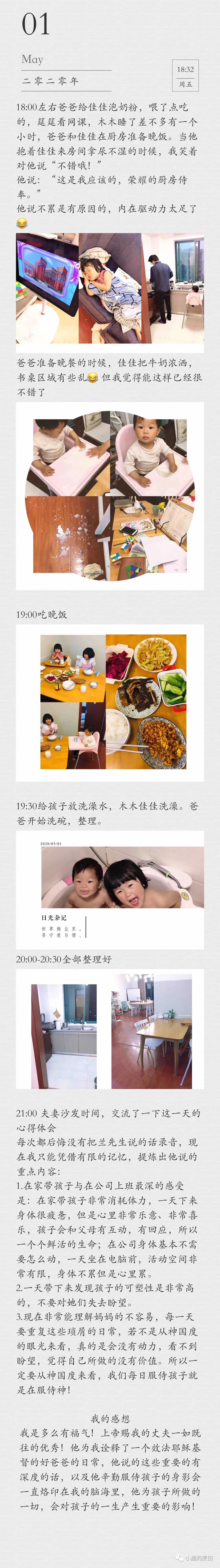 比如最近我们讨论过觉得要一直坚持的是:9点准时熄灯,让孩子早睡,晚上他争取7点前到家,这样晚上我们就有一个多小时的家庭时间,一起吃点东西聊聊天,唱诗歌,听道,给孩子阅读等等,都可以分散在每一天的这个家庭时间,每天只选择一项,每天可以有不同的内容。这样调整后我觉得特别好,最重大的一个改变就是我们睡眠时间都提前了,晚上的时间没有那么匆忙,孩子有更多时间和爸爸在一起,我们夫妻的沙发交流时间也比以前要多。